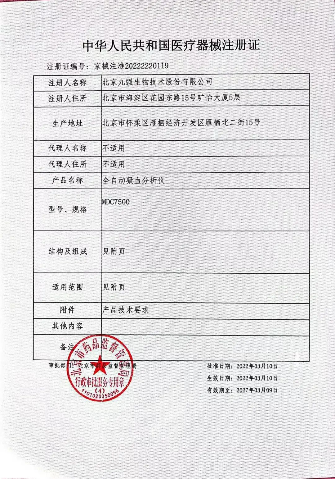 蓝冠娱乐官网生物全自动凝血剖析仪MDC7500顺遂取得北京市药品监视管理局揭晓的《医疗器械注册证》 。