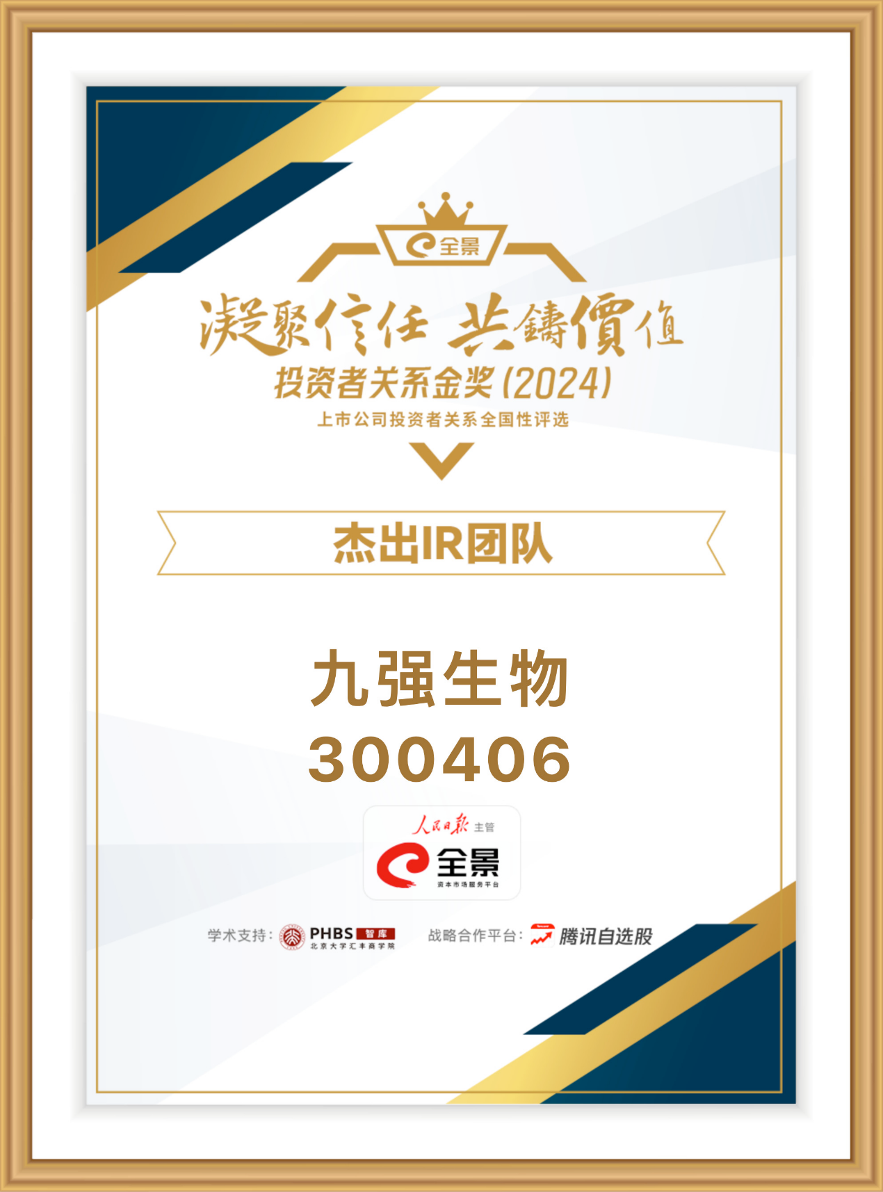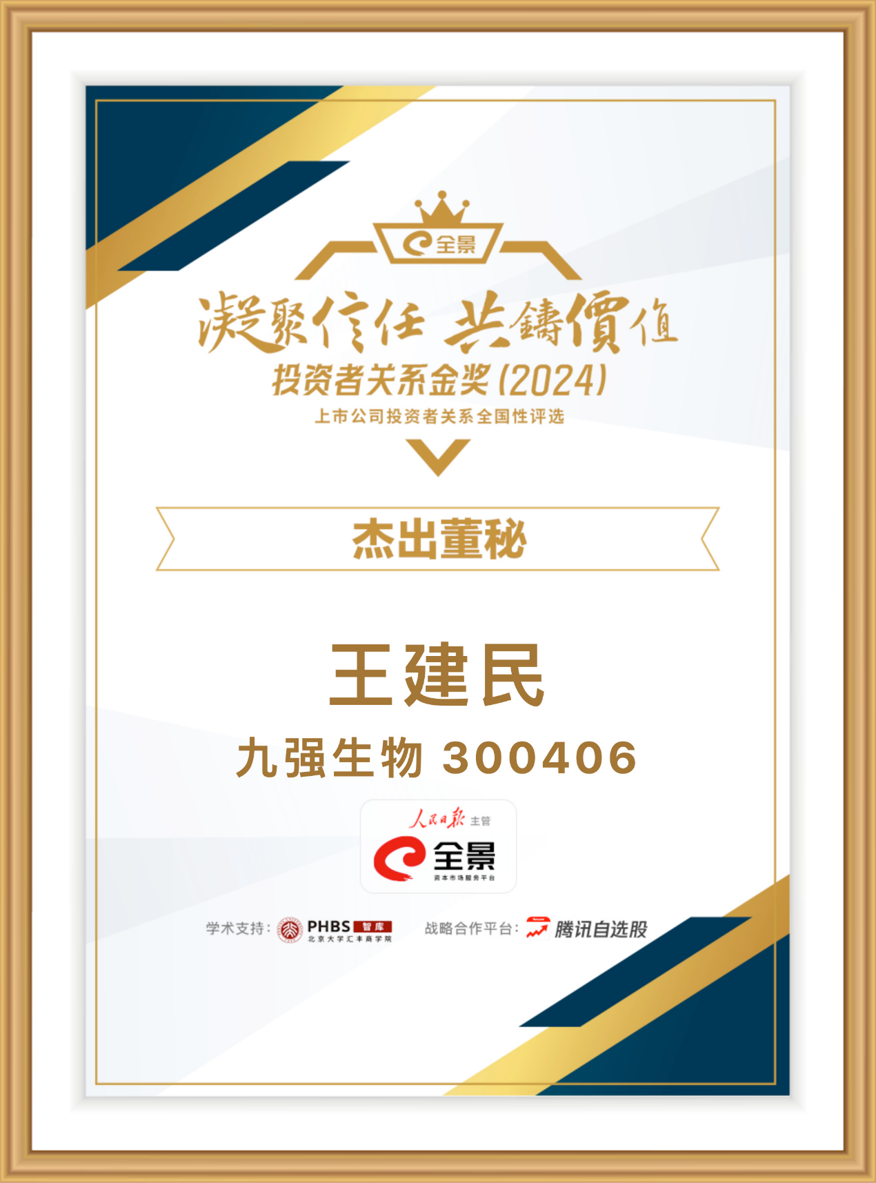 克日 ,第六届全景投资者关系金奖盛大揭晓。蓝冠娱乐官网生物(300406.SZ)在此次评选中荣获“优异IR团队”奖项 ,蓝冠娱乐官网生物董秘王建民先生获“优异董秘”奖。